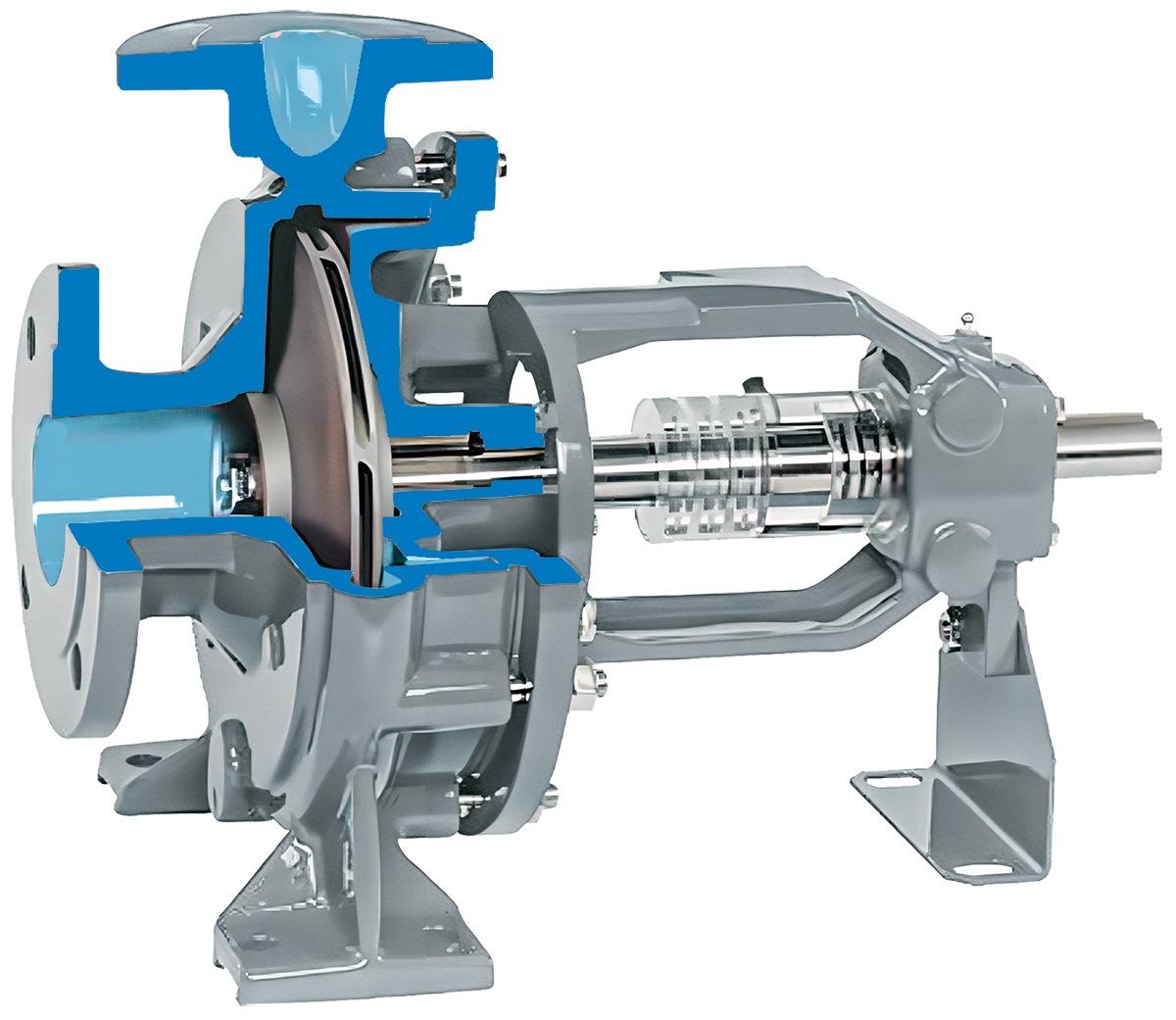 Насосы серии МНХР имеют одноступенчатый односпиральный корпус. Всасывание осуществляется аксиально, а нагнетание — вертикально вверх.